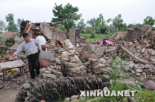 5月4日,湖北当阳市坝陵办事处荣耀村村民从倒塌的房屋中清理尚可使用的生活用品。新华社发(