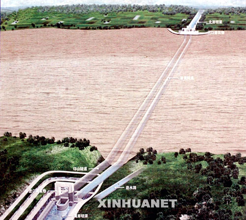 这是南水北调中线穿黄工程效果图(2007年5月7日摄) 这是工程人员在穿黄隧洞口施工(2007年5月