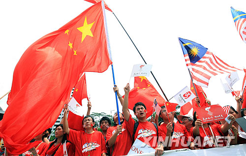 4月21日,华人华侨在起跑仪式现场为奥运圣火传递活动加油。当日