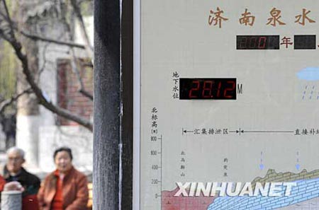 济南趵突泉公园内的标识牌标明趵突泉地下水位降至28.12米受干旱少雨天气的影响,加之济南郊区开始农业