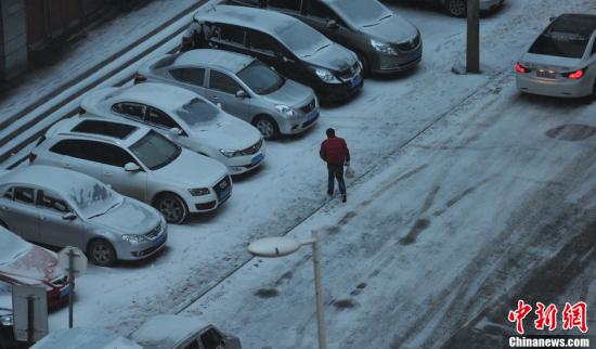 11月18日,行人在沈阳街头的积雪中穿行。当日,沈阳迎来今年立冬后首场较强降雪。降雪从当日早间开始,