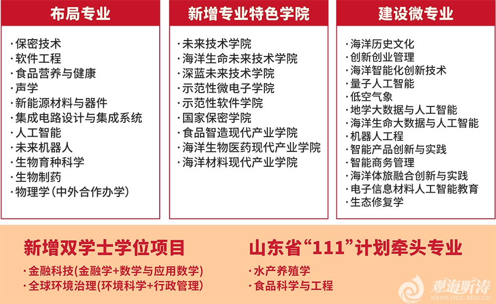 “十四五”期间,中国海洋大学坚持以习近平新时代中国特色社会主义思想为指导,全面落实立德树人根本任务,紧扣国家战略和时代发展需求,以学生发展为中心,遵循“价值引领、融合创新、质量为本、追求卓越”的基本原则,高质量实施《中国海洋大学一流本科教育行动计划(2019—2024)》,全面提高人才自主培养质量。一、.深化内涵建设,专业水平实现新跃升主动服务国家战略和区域经济社会发展,布局集成电路设计与集成系统、新能源材...