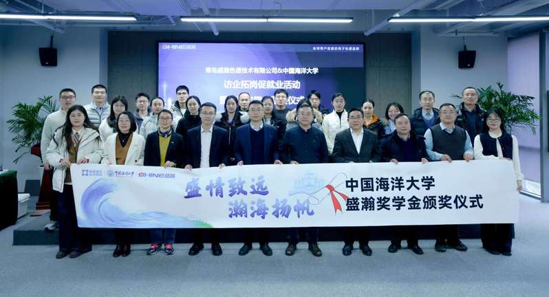 本站讯 1月27日,中国海洋大学化学化工学院与青岛盛瀚色谱技术有限公司联合举办的访企拓岗促就业活动暨中国海洋大学盛瀚奖学金颁奖仪式举行。青源峰达集团、盛瀚色谱创始人朱新勇;学院党委书记李召斌,院长李先国,副院长包木太、夏树伟,党委副书记李新,海洋化学理论与工程技术教育部重点实验室副主任梁生康等参加活动。