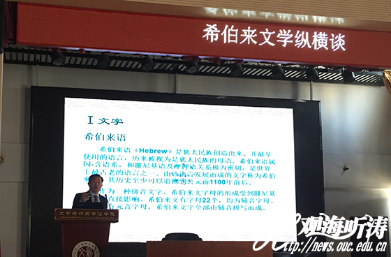 本站讯 4月28日上午,我国著名犹太-以色列文化研究学者、南京大学哲学宗教系教授、博士生导师、犹太文化研究所所长徐新做客海大人文讲坛,在文新楼乐海堂为海大师生带来一场题为“希伯来文学纵横谈”的讲座。讲座由罗贻荣副院长主持,学院蒋秋飚书记、李萌羽教授、闵锐武副教授、陈永生副教授、仇红博士等聆听了讲座。