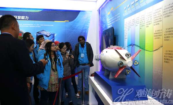 师生们前往国家深海基地管理中心进行参观。讲解员详细介绍了我国在深海和大洋资源的勘探、调查、深海观测等方面取得的重要科研成果,同学们兴致盎然,纷纷竖起大拇指,对中国在深海研究和海洋权益保护方面取得的成就大加赞赏。讲解员对于“国之重器”——7000米级载人潜水器“蛟龙”号从诞生到使用,从海上试验、试验性应用到业务化运行3个阶段进行了简要的介绍,满足了大家的好奇心与求知欲,对于“蛟龙号”创造的下潜7062米的载人作业型潜水器的深潜纪录,同学们惊叹不己。来自同济大学的苏丹籍博士Abduallah表示,希望将来能够在深海探测领域开展更多交流合作,更希望有一天自己能够登上“蛟龙号”,探索神秘的深海世界,聆听海洋深处的声音。