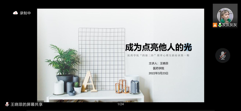 本站讯 3月23日晚,医药学院开展第一期“四级二阶”朋辈心理互助培训,培训主题为“成为点亮他人的光”。本次培训由辅导员王晓菲主持,医药学院团委书记赵炜、辅导员郭吉昱、心理健康协会成员、本硕博各班心理委员、研究生心理气象员和本科生宿舍长共195人参与了本次培训。