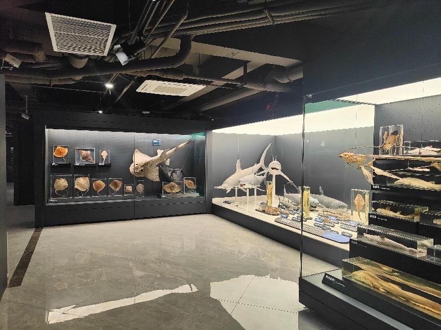 馆内七百余种、三千余件标本,最早可追溯至20世纪40年代,是一件来自李沧区的柔质仙菜标本。馆内标本大多源自学校前辈教学科研积累,部分来自校友捐赠。“这些标本是海洋生命演化的‘活档案’,见证了海大生命学科的发展历程。”高泽榕指着展柜中一件珍贵的海洋生物化石介绍,博物馆以“栉风沐雨,披荆斩棘”的学科成长史为序,通过“海洋栖息地”“演化的奇迹”“生命万象”“深海居民与地球三极”四个篇章,全方位展现海洋生物世界的奥秘。