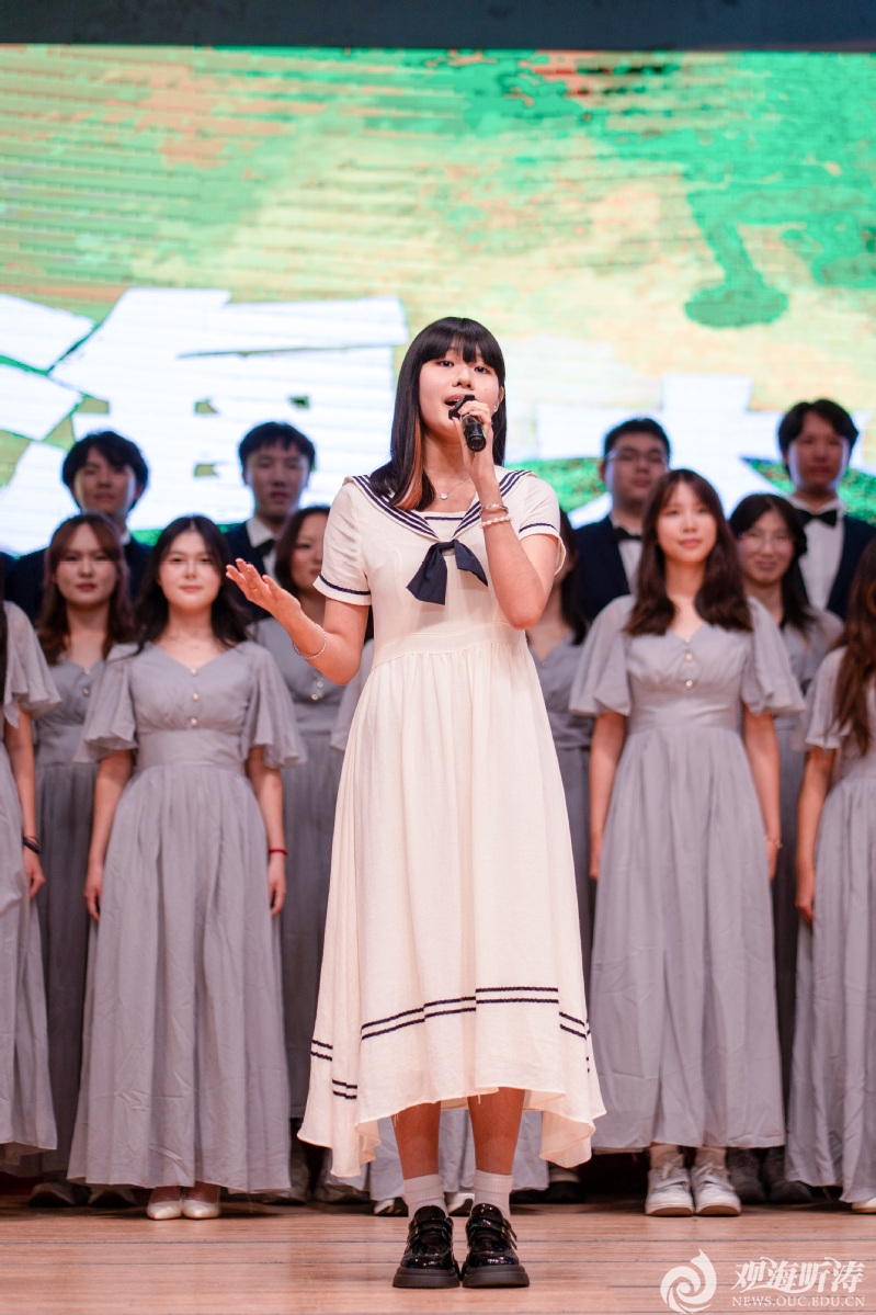 随后,合唱团以无伴奏合唱的形式,深情演绎了《这世界那么多人》。钢琴的琴音如月光流淌,低声部的吟唱沉稳而直击人心,高声部的旋律则悠扬婉转,绕梁不绝。和谐动人的和声,仿佛将“这世界那么多人,多幸运,我有个我们”的慨叹与珍视,缓缓注入每个人的心田。在母校101岁华诞的特殊时刻,这首歌被赋予了更深刻的意义——幸运的是,在海大,我们拥有了彼此,共同构成了青春记忆里最闪亮的“我们”。