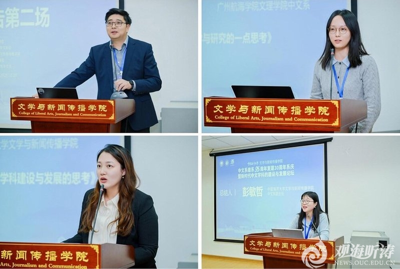 下午,论坛第二场学术报告在文新楼322学术报告厅举行,中国海洋大学文学与新闻传播学院中文系主任聂友军主持。中南大学人文学院副院长、中文系主任龙丹分享了中文学科交叉融合的发展经验,为中文学科发展注入了蓬勃动力;江苏海洋大学文法学院院长吴明忠针对中文专业的发展现状,反思了如今学界“孤芳自赏、坐而论道”等现象,强调创作能力培养对中文教育的重要性;海南热带海洋学院人文社会科学学院院长王志峰提出要以基础研究为源头活水,倡导中文学科与历史学科的协同发展,打开了跨学科合作的新视野;宁波大学人文与传媒学院中文系主任周景耀直面技术革命挑战,提出更新学科理念、突破旧有范式的思路,为在智能化时代坚守中文教育本质指明了方向;浙江海洋大学师范学院中文系主任周驰觐分享了“教育三习”理论与海洋文献整理相结合的办学特色,对海洋文学教学研究的丰富发展具有启发意义;广州航海学院文理学院党委书记李华武从学科协同的角度,探讨了中文学科与海洋特色学科的融合路径;广州航海学院文理学院中文系青年教师郑晴心从教学研究角度着眼,论述了打开“中文”与“海洋”对话的丰富可能性;中国海洋大学中文系青年教师温雅红强调文字功底、新媒体能力与政策敏感度的重要性,提出借助科技创新推动中文学科发展。