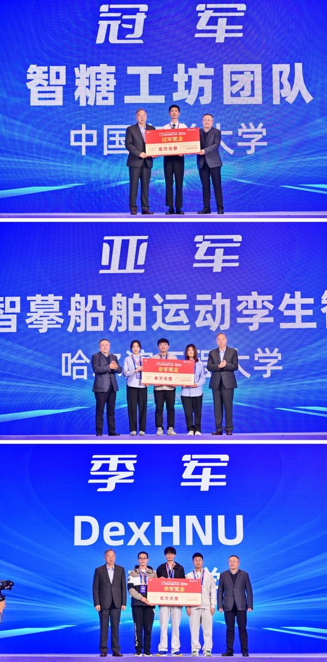 大赛总决赛分为分组答辩赛和公开总决赛。来自全国100余所高校的250余支队伍在完成报到与赛前抽签后,于10月29日分为7组进行分组答辩,15支优胜队伍于10月30日上午参加总决赛冠军争夺赛(路演)。大赛设国际参赛组,10支队伍进入总决赛并参加现场答辩。总决赛共评选出一等奖64项,二等奖186项。经过激烈角逐,中国海洋大学智糖工坊团队作品《深度建模与智能生产调控赋能低聚糖绿色制造》、哈尔滨工程大学虚舟智摹船舶运动孪生智导者团队作品《虚舟智摹——船舶运动孪生智导者》和湖南大学DexHNU团队作品《类人灵巧臂——手智能化作业平台》分别斩获冠军、亚军、季军。此外,73所研究生培养单位获优秀组织奖,96名指导老师获优秀指导教师奖。