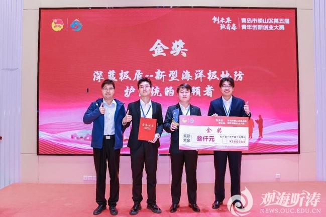 本站讯 11月3日,青岛市崂山区第五届“创未来·致青春”青年创新创业大赛决赛在青岛市国际创新园举行。中国海洋大学材料科学与工程学院深蓝极盾团队通过层层选拔,进入决赛环节,最终以第一名的成绩斩获大赛金奖。
