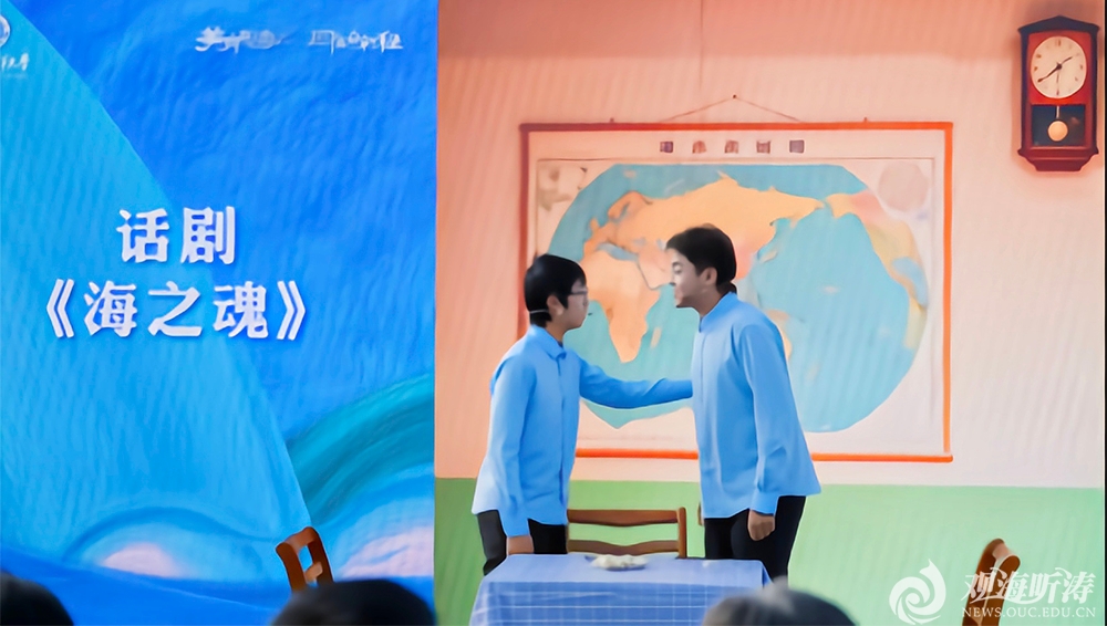 现场艺术演绎精彩纷呈,基础教学中心艺术系学生、大学生艺术团及海鸥剧社先后带来合唱《问道沧海》、声韵合颂《蓝色梦想》、话剧《海之魂》、情境叙事合唱《蓝色畅想》等节目。《问道沧海》回溯学校百年办学初心,《海之魂》再现革命烈士科研报国的英雄事迹,多样艺术形式让理论宣讲更具感染力,实现了思想引领与审美体验的同频共振。