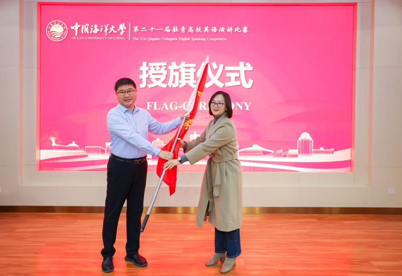 颁奖仪式环节,评委对选手表现进行了专业点评。授旗仪式上,中国海洋大学外国语学院党委副书记、副院长戴淑妮向青岛科技大学外国语学院党委副书记、副院长马寒移交赛旗,下一届大赛将由青岛科技大学主办。