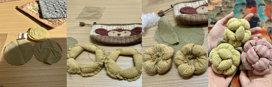 随后在盖老师的指导下,同学们亲手缝制起属于自己的那朵耐冬花。首先制作花朵主体部分,将5cm圆布片对折,沿边线用平针缝制,预留三分之一的缺口填充珍珠棉,然后再叠加下一块圆布,依次交叠缝制将5片“花瓣”首尾相连,第二圈收紧线头后再加固缝制一圈。之后用同样的方法缝制内层的3片花瓣,最后将两层花瓣组合缝制在一起花朵主体部分便制作完成。随后,将7cm圆布片对折两次沿边平针缝制,在尾部收紧线头并固定便制作好了一片叶片。最后将做好的花朵主体和叶片组合在一起,在背部缝线连接,用小圆片覆盖背面收线的布料,并填充适当珍珠棉,一朵“纯手工”耐冬花便跃然指尖。