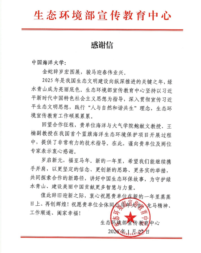 本站讯 近日,生态环境部宣传教育中心向中国海洋大学发来感谢信,感谢学校和海洋与大气学院鲍献文教授、王楠副教授在我国首个蓝旗海洋生态环境保护项目开展过程中提供了有力支持。
