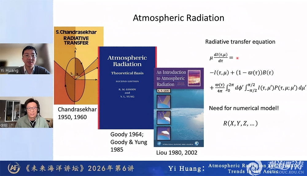 本站讯 3月18日,应未来海洋学院院长李建平教授、学院导师黄菲教授联合邀请,加拿大麦吉尔大学Yi Huang教授做客“未来海洋讲坛”,作题为“Atmospheric Radiation and Climate Trends in the Arctic”(北极的大气辐射和气候趋势)的学术讲座。未来海洋学院院长助理徐昭副教授主持讲座,包括未来海洋学院学员在内的线上线下共计1.6万余位听众参与了讲座。