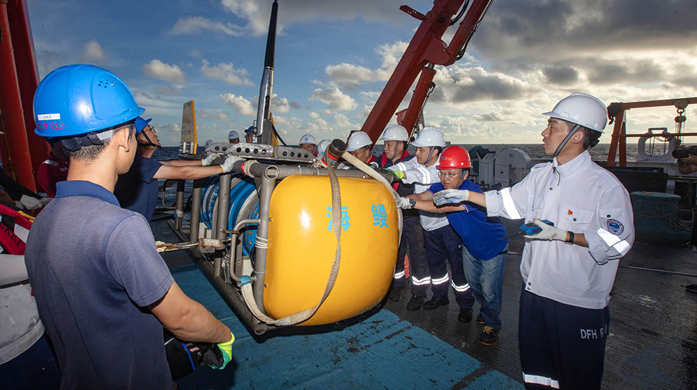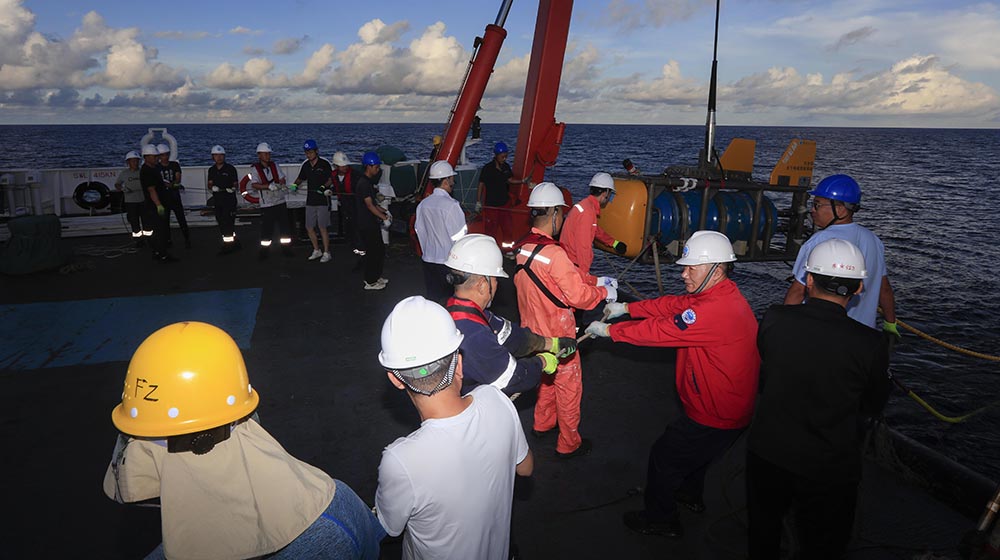 科考船即将到达测试海区。为保证顺利布放和设备人员安全,整个流程各环节需要大量人员紧密配合,因此除了值班船员和搭载任务的队员以外,船上实验室、甲板部、轮机部、事务部工作人员和调查队员齐聚后甲板,根据统一指令,开始了紧张有序的布放工作。当名为“海鳗”的主要设备顺利入水,布放环节圆满完成,后面项目组将对设备各指标进行测试,以检验其性能,为后续正式作业打好基础。