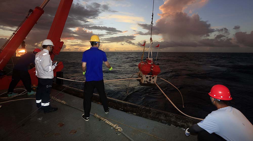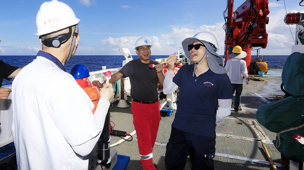 晚饭后工作继续,大家却对回收方案产生了分歧。一种意见是求稳,释放一套回收一套,避免出现因光线变暗能见度降低释放后无法回收的危险。一种意见是借鉴前面的经验,一次集中释放三套分别回收,提高工作效率。经过讨论,首席科学家和船长决定采取第二种回收方案。紧张的回收工作随即开始,释放后等待的时间似乎更加漫长,而一点点落下的太阳如同巨石,增加着人们心头的压力和紧张的情绪,当听到“找到了”的呼喊,简单的三个字在这个黄昏已经成了世界上最美妙的声音,最终在科考船与科考队的紧密配合下,在夕阳没入海面的最后一瞬,第三套接收站顺利上船。大家的心情从开始的紧张到逐渐放松,再到最后由衷的喜悦,夕阳照在人们被晒得通红脸上,大家顾不得擦去汗水,纷纷站在船边,用手机记录着这一刻,也释放着紧张了一天的情绪与疲惫!