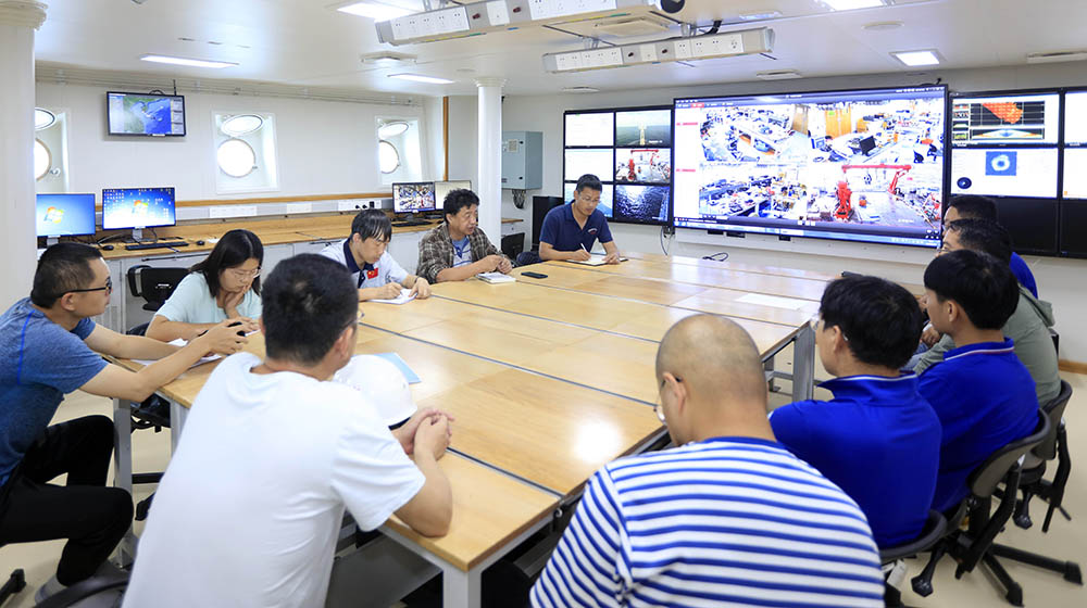 7点45在实验室开会研究处理方案。根据推测,问题可能出现在两个方面,一是因为仓内空气中水分凝结导致电路故障;二是长途陆路运输造成设备内部线路或零部件松动。无论哪种问题,都需要开仓检查。在检修方案上,出现两种意见,一是船在海上受风浪影响不稳定,开仓过程中容易导致仓体受力不均出现形变,因为仓体是铝合金材质,一旦出现形变将无法修复,建议返回三亚检修;第二种意见是考虑到海况比较好,且本航次前期受各种不可抗力影响已经延误了较多的时间,建议在做好万全准备的情况下,在船上抢修,但这需要船上工作团队与科考队的通力协作。科考队负责仓体模块的团队持第一种意见,船长杨文、船上实验室主任宋振杰和轮机长宋海波则详细询问了仓体情况后,结合海况及船上条件,建议在船上抢修。以我的观察,相比较而言,对于调查船一方而言,反倒是执行第一方案相对保险。但杨船长、宋主任和轮机长还是很中肯地提出了在船上抢修的意见,供首席科学家决策,充分体现了科考船团队急科考任务所急,想科学家所想的高站位和专业、严谨、负责的工作态度,这既是“东方红”科考船队的优良传统,也是这支队伍战斗力的体现。在关键时刻能给出科学意见供决策参考,也源自于这支队伍对自身实力的高度自信!