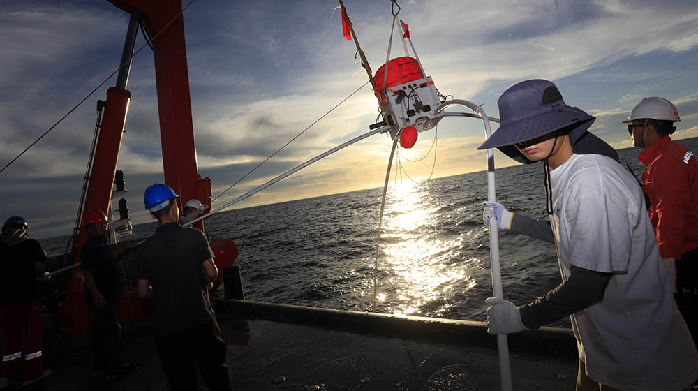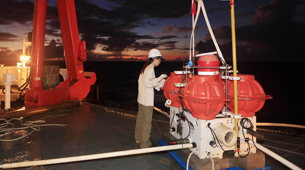 早饭后工作继续。经过几天的磨合与熟悉,每个岗位的队员对自己负责的工作已经很熟练,有的在组装采集站、有的在进行最后检查,大家分工合作,甲板上人来人往,忙碌而有秩序。除了炽热的阳光,雨也不时来凑热闹,刚开始大家经常被搞得手忙脚乱,因为很多线路不能接触水,必须随时进行保护。中午时分,采集站布放完成,下午三点,发射仓入水,开始拖航作业,刚才还热火朝天的甲板,立刻安静下来。