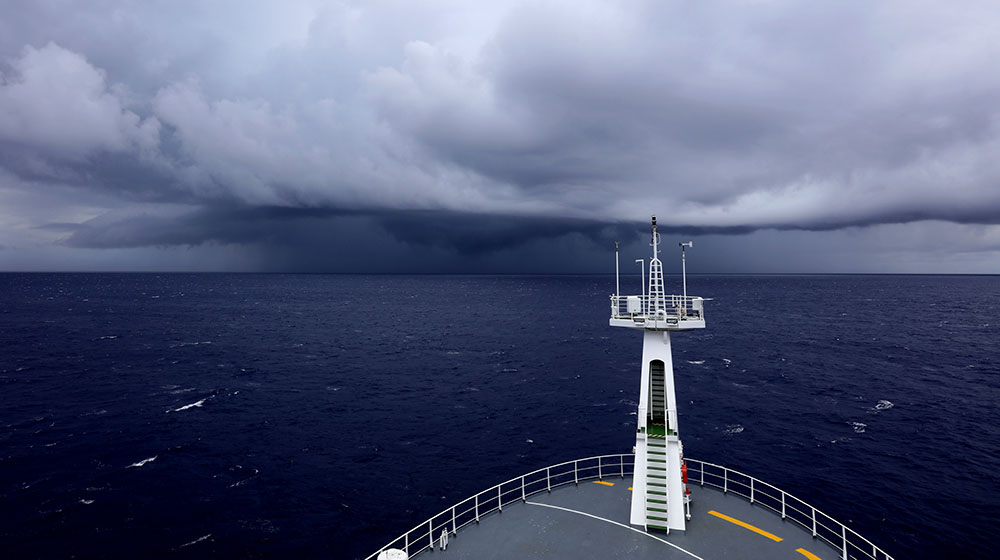 今天早晨醒来,外面天气大变,风力一点点增强,天上乌云密布,不时大雨倾泻而下,海浪也越来越高,已经能明显感受到船的摇晃,到驾驶台一问才知道,我们迎面撞上一个热带低压,大雨从昨夜已经开始了。上午八点,早晨还能看到阳光的天空完全被厚厚的乌云所掩盖,天海之间一片苍茫,六七级的大风卷着密密的雨在空中横飞,如一条条长长的绳索,鞭打着周围的一切。甲板上的积水随着船身的摇摆左冲右突,水面上被疾风扫过,卷出细密的波纹,如被揉皱的丝绸在随风飘荡。以我有限的出海经验,这样的天气与海况对很多第一次出海的科考队员来说,是比较大的考验,中午吃饭的人仍然不多。到了下午,风雨渐消,涌浪渐小,大海慢慢平息下来,前进方向的天空渐渐放晴,这预示着天气在逐渐变好,对于科考队而言,无疑是一个好消息。航渡时天气恶劣,到站后岁月静好,既让大家体验到了真实的出海生活,又不影响调查作业,简直是天公作美,一切都是最好的安排。