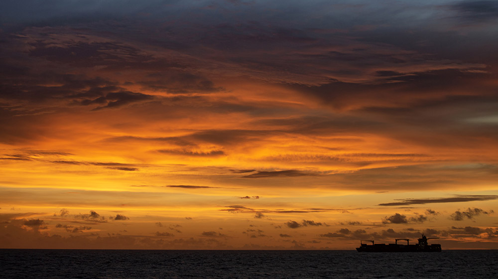 晚饭后,到驾驶台上甲板看夕阳,天上云量较大,日落有些潦草。反倒是东方的天空,有一片如山的积云依次排列,在目送太阳的谢幕。其中一处迅速变大、变高,堆堆叠叠,从天际升腾到天顶,开始时云顶还有一抹余晖,在视线游离的瞬间,色彩已然褪去,变成铅灰,从上到下渐变,到云底部终于成为一抹浓重的黑,隐约有一片雨幕连接了云与大海,如水墨的晕染。很快,光线退去,黑暗降临,那片云也渐渐融入到越来越暗的天色中去了。